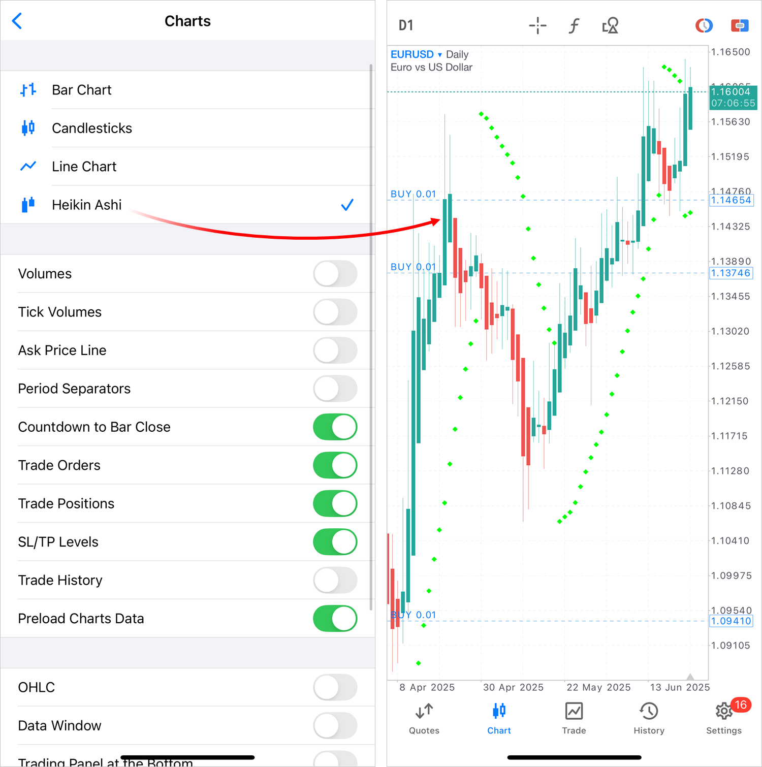 要查看平均 K 线图,请点击图表并访问设置。